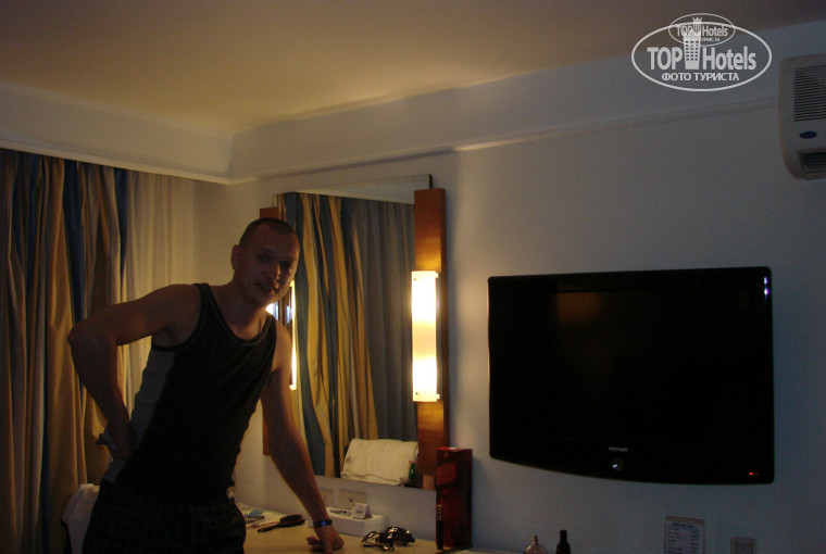 Сам номер не плохой, только мне показалось маленький, потом привык, телевизор плазма, дешевенький, три русских канала, мини бар, беспонтовый кстати, ну и большая тахта. Номер убирают не часто, даже если оставляешь чай, хотя, какого хера, должны и так убирать каждый день, иногда приходилось бегать за уборщиками, что бы убрали номер.
