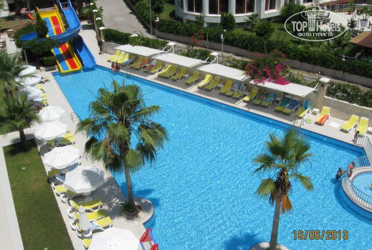 Отель для семейного отдыха – в нем в основном отдыхают семьи с детьми, одиночек и компании которые своей активной «жизненной позицией» могут испортить отдых другим в отеле нет – что нас очень даже устроило. Территория отеля не большая, но очень ухоженная… я бы сказал очень уютная. От бассейна и горок моя дочка в восторге. Для детей есть так же небольшая детская площадка, по вечерам сеансы мультфильмов и обязательно мини-диско с забавными танцами. Загорать можно как возле бассейна так и на пляже. Пляж галечный, лежаков в принципе достаточно – можно загорать на самом пляже, либо на лужайке в тени деревьев. Хочу отметить КРИСТАЛЬНО ЧИСТОЕ МОРЕ!!!! Сам отель тоже чистый – персонал постоянно что-то моет, чистит... Номер у нас был на 4-ом этаже с видом на бассейн. Номера чистые (своевременно убираются), в номере спутниковое телевидение с русскими телеканалами в том числе (правда смотреть телевизор времени то и не было).