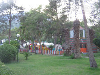 Природа чудесная, много деревьев, цветов детская площадка в тени.
