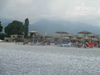Пляж: песчаный около зонтиков, остальное все галька, вход в море - большие камни. Не очень удобно. Обязательна специальная обувь.
