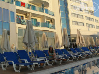 Территория нам тоже понравилась, хотя и не большая, очень чисто, всем места для отдыха хватит! Вот у основного бассейна, а их там 2, с лежаками проблема, умные занимают с утра, а сами на море, вообще мы слышали сами как некоторых ругали за это, нельзя так делать, но есть наглые! На море замечательный ресторанчик, можно обедать, весь в тенечке, с 11:30 пекут вкуснейшие лепешки с разными начинками. На пляже вы всегда найдете свободное место и не одно, проблем нет, мы с самого утра не бежали занимать, ходили в разное время. Песочек чистый, море тоже чистое, очень хорошо маленьким детишкам купаться мелко, взрослым нужно пройти прилично, чтобы поплавать))) На пляже игры, гимнастика. А еще на территории отеля есть небольшой детский городок, водные горки. На море мы ходили пешком, очень близко 5-7 минут, есть автобус, но нам он не понадобился. Никакой большой горы там нет, небольшой склон если так можно назвать, нужно перейти дорогу, движение спокойное.