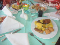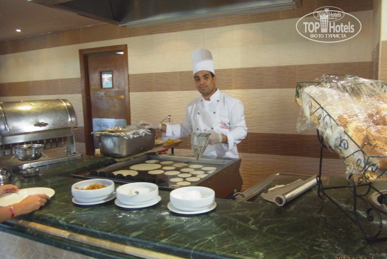 Самое главное еда отвратительная. Готовить не могут. Два основных ресторана, в которых еда одна и таже. Фруктов не дождётесь. Всегда красные яблоки и зеленые апельсины. Часто, но не всегда виноград. За неделю давали 1 раз бананы. Дыню 2 раза. Есть невозможно, как вата. 1 раз давали арбуз, но как! Повар разрезал арбуз на шесть частей, потом резал на тонкие ломтики. Давали по три ломтика. Ломтик арбуза светился, как клиновый лист. Когда девушка подошла и сфотографировала это дело. Подошел другой повар и стали давать по 5 кусочков и нарезать куски потолще. Финики забродившие. Завтрак отдельная история. В основном наше семья на завтрак ест блинчики. Но можно взять только 3 блинчика. Повар, который готовит блинчики, считает себя богом. Он очень любит поговорить с другими поварами, только не делать свою работу. Около него всегда очередь, если ее нету готовить не будет. Однажды ждали 20мин. Муж подошел с тремя тарелками, т.к. нас троя. На что, он сказ что давать не будет, мой муж должен три раза отстоять очередь. Мало того что жди, когда он начнет печь, он еще не хочет давать. Первый раз в жизни на отдыхе пришлось ругаться. На что нас обозвали русской мафией. Когда, я его захотела сфотографировать, он от меня начал прятаться, но я это сделала! Готовят отвратительно. Все, что брали есть невозможно. Картошка не доварена, рыба сухая. Как жирную рыбу скумбрию, можно сделать сухой? Мясо еле жуется, ножом не разрезать. Людям со вставной челюстью ехать не рекомендую. В отзывах читала, что дети едят один рис. Да это правда, кроме него есть нечего. Готовят макароны при тебе. Мой ребенок любит макароны, но даже он отказался их есть. Кто любит картошку фри, пожалуйста в этот отель. Люди как будто не разу ее не ели, очередь громадная. Пицца несъедобная, но люди едят. В пиццу с сыром кладут красный перец. Один раз мой ребенок откусил кусочек, потом стаканам воды запивал, больше не ел. На пляже в баре, тоже оригинально готовиться пицца. Хотела сфотографировать, не получилось. Тонкая, сухая, посыпана неизвестно чем. Стояла ждала, когда приготовиться минут 15. В 4 бар закуски убирает. Пицца приготовилась к 4 часам. У двоих тарелки были им дали. Остальные были бес тарелок им соответственно не дали. Попросили тарелки, не дали. Бери в руки. А то, что люди стояли и 15 минут ждали, это ничего. У них финиш. Совет берите тарелку и ждите. Во время ужина на у лице, что ни будь готовят на гриля. Крабы готовили один день. Через два дня лежали в лотках с едой, никто набрал. Один раз давали креветок. Наблюдала картину. Подошел подросток, ему наложили три головы от креветок. Ешьте пожалуйста. Попробуйте дома съесть три креветки или три краба, вы будете сыты? Салаты заправлены. Есть порезанные огурцы, помидоры, нашинкован лук, красная капуста, морковь. Болгарский перец был 1 раз зеленый. Выпечка пресная и не вкусная. Если есть, что-то съедобное разбирается за 5 минут. Поэтому люди завтракают в 7-00, обедают в 12-00, ужинают 18-00. Придете позже можете не поесть. Поздний ужин с 23-00 до 24-00, есть нечего, что осталось после ужина. Главный совет берите таблетки не только от диареи, но и от тошноты (мой ребенок постоянно жаловался, что тошнит), вообще все для пищеварения. Для самых умных, кто пишет еда на 5. Воду пьем из бутылки, в бассейне воду не пьем, зубы чистим и щетки ополаскиваем из бутылки с водой. Это для того, чтобы не писали, что 
