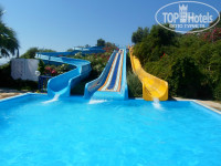 Территория отеля большая, хамам с крытым бассейном, два больших открытых бассейна и один маленький с тремя горками.