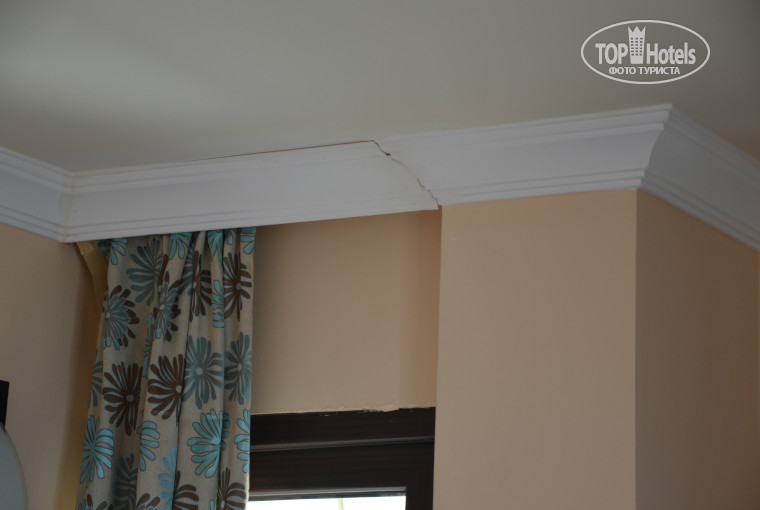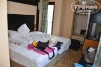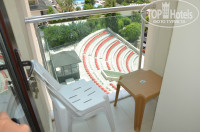 НОМЕР на 2 этаже оказался примерно 15м2 вместе с коридором.ванной и балконом. Кровать почти у стенки с двух сторон,напротив трюмо, шкаф впритык к трюмо, а поэтому положить реально туда вещи только с одной стороны. Ванна нормальная,но темная,света мало, фен висит на проводах, унитаз кривой, душ забивается. Балкон 1м2 максимум.муж курил стоя,потому что даже сесть на стоявший там стул нереально!! Окно выходит на море-красиво.но балкон выходит на анимацию,поэтому для туристов с детьми не подходит- спать невозможно.