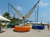 Хорошая детская площадка на пляже под тентом. Для нас это всегда палочка-выручалочка. Рядом с площадкой батут-прыгалка. Она платная.