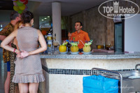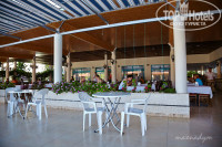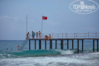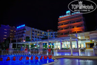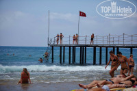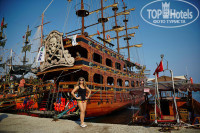 Территория: очень маленькая. Отель зажат между двумя другими отелями. До пляжа 2-3 минуты под дорогой. Все в цветах и зелени. Ночью подсвечено. Бассейнов 2, возле каждого бар. У того, что с горкой (там 2 полудетские горки) наливают только в пластиковые стаканы. И работает он не пойми когда. Горки тоже работают по графику. В 4 их отключают. В баре у главного бассейна часа в 4 приносят легкие закуски и сладости. Советую подойти за 10 минут и взять тарелку - в 4 люди набегают, как тараканы и образуется очередь. В баре Джин, Водка, Ракы (анисовая водка, похожа на самбуку или Озу египетскую), пиво, красное и белое вино, минералка, пепси, спрайт, фанта и 2 вида соков из концентрата (пить можно). Наливают в стекло. Есть "учебный" бар на пляже - только прохладительные напитки. Проносить с собой на пляж спиртное нельзя. В соседнем отеле Blue Fish в баре на пляже есть пиво, но мы так и не подошли - браслеты другого цвета. Но, думаю, пару раз можно пивка и там испить. Если у кого остались браслеты желтого цвета берите с собой - это цвет соседнего отеля))) Все бары закрываются ровно в 11 вечера, даже если дискотека еще не закончилась. Это касается не только спиртного - остается только вода и сок (если повезет). Совсем поздно ночью можно попить кофе из автомата (бесплатно) в самой столовой, открыта террасная дверь.