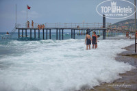 Пляж небольшой. Построен новый пирс для захода в воду. На пирсе натянуты канаты - не садитесь и не облокачивайтесь на них, они ненадежно зафиксированы. С пирса можно нырять, глубоко. Солдатиком иногда доставал пальцами до дна. Море было бурным - до 4 баллов. Говорят это норма. С берега заходить опасно - скользкие плиты. В 100 метрах левее есть песчаный пляж без лежаков.
