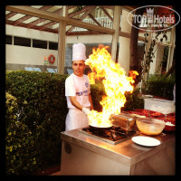 Выбор блюд (если вы кончено пришли к заранее) хороший, несколько видов мяса, вкусные салатики. Каждый день на ужин гриль и арбуз (за все время один раз была дыня, и черешня). Фрукты не нарезаны. Т.е. лежат себе апельсины, как хочешь, так и режь-чисть. Выбор фруктов ограничен апельсинами, абрикосами сливами и яблоками. Иногда бывают персики и черешня (хотя может и всегда, просто заранее мы не приходили, т.к. опять же - очереди). Еду не обновляют, кто успел, тот и съел. Видимо поэтому отдыхающие набирают с запасом, который не могут потом осилить, и это все остается на столах, у бассейна, на пляже и т.п. (еду неси куда хочешь, это никого не волнует).
