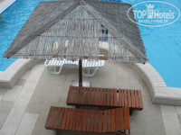 Бассейн маленький,но зато с морской водой.Тоже при нас чистили тщательно.Что-то делать надо с ласточками-везде следы от них-и в бассейне и вокруг.Надо их куда-то переселить.Чаще были на море,но один раз попали на акваэробику.С нами двумя 10 мин позанимался аниматор .
