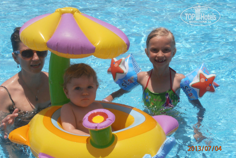 Территория ухоженная, удобно спланирована. у каждого из больших бассейнов свой бар и дет бассейн. Несмотря на заполненность отеля, места на пляже и у бассейна всегда были. Единственно быстро заканчивались пляжные полотенца и их уже нигде было не найти, мы свои не сдавали в стирку 4 дня. Дети в детской анимации не участвовали, только на мини диско - сказали, что русскоговорящая девушка уехала, но они от этого не страдали. А вот нам с мужем хотелось поучаствовать и в водном поло и в водных командных состязаниях, но в нашем бассейне, все только на итальянском языке, в том числе и аквааэробика.