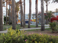Территория отеля. Не сильно большая, но всё чисто, аккуратно, достаточно зелени, цветов. Бассейн и горки для всех возрастов. Только есть пожелание спасателям смотреть за горками лучше, чтобы дети не взбирались на горки и не стояли под ними, а то если ребёнку на голову приземлится 100 или более кг. живого веса или собьёт его как кеглю, думаю проблем будет немало. Возможность отдыхать с чашечкой кофе как у лобби-бара в отеле, так и на воздухе у бассейна или на пляже в баре.