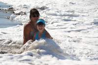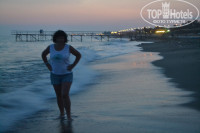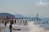 На пляж проходишь прямо с территории отеля через подземный переход за 1-2 минуты. Лежаков и матрасов там хватает на всех желающих! Первую неделю мы, начитавшись рекомендаций, заходили в море со стороны Timo и все равно нарывались на камни. А потом открыли прекрасный вход - сразу за пирсом ( 2-3 метра галька и потом мелкий песок). Заходила с дочкой 8 лет совсем спокойно, даже когда были волны. В баре на пляже очень вкусные лепешки. Обязательно попробуйте! А вот мороженое нам там продавали по схеме: 1$=1€. Вечерами, прогуливаясь по поселку, мы часто покупали мороженое в шариках ( попробовали почти все вкусы) . Стоит 1$ - 2 шарика.