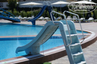 В пансионате три бассейна: маленький, глубиной где то в метр, для совсем маленьких деток. Основной, с переменной глубиной, от 0 до 2 метров и бассейн, в который народ спускался с горок (глубина чуть больше 1 м). Бассейн работал весь день с перерывом с 13:00 до 15:00. Мне неудобств это особо не доставляло. В маленьком бассейне была горка для маленьких, ну типа как на детских площадках, только в воду оканчивались, в основном была горочка побольше, для деток 5-6 лет, ну и основные горки. Классический спуск, желоб и такая закручивающаяся. Которая закручивалась мне не понравилась, а вот с остальных я с удовольствием катался. Горки работали по часам, было три интервала. Время помню только вечернее - с 18 до 20 часов. Бассейны были естественно чистые.