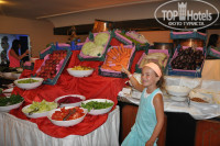 Свежие овощи, овощи на гриле, супы (борщ, куриная лапша), много мяса (баранина, говядина, телятина, язык, цыпленок, индейка) в разных вариациях (на гриле, тушеное, на вертеле, с овощами, диетическое), рыба, суши, гарниры, салаты разнообразные (даже оливье!), на завтрак каши (гречневая, рисовая, овсяная), блины, пончики, яйца, йогурты, выпечка.......фрукты (бананы, персики, абрикосы, сливы, яблоки, груши, апельсины, грейпфрукт, дыня, арбузы), сладости (очень много!). Для совсем маленьких были какие то тоже кашки, стоял термос с горячим и холодным молоком, блендер, баночки с питанием (2 евро правда стоили). Каждый ужин был тематическим, то итальянский с различными вариантами пасты, то китайская кухня с улитками и лапшой, турецкая с национальными блюдами и представлением. Есть детский уголок в ресторане с мультиками. На ужин там накрывают столы и детки сами себе все накладывают и общаются. Напитки разносят официанты, что очень удобно, не надо толпиться у бара, по первому зову сразу бегут:). Вообщем праздник "живота" обеспечен, только и успевай плавать и участвовать в анимации, что бы не набрать килограммы:))).