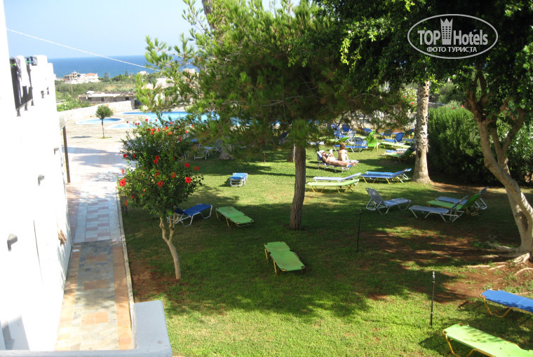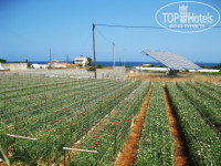 Отель находится "в глубинке"- в отдалении от оживленной дороги, в деревушке Аниссарас. Видно море, но сам отель окружают, в основном, чьи-то поля и огороды, а по дороге на пляж (15-20 мин) можно увидеть и коз, и кур, и целую плантацию гвоздики. Возможно, такая прогулка покажется утомительной для детей. Ближайшие пляжи в основном каменистые, чтобы выбрать получше, нужно опять-таки пройтись по набережной влево. До ближайшего города такси обойдется 7-8 евро, до пляжа и в Херсониссос ходит бесплатный автобус в 10-00 12-45 13-00 15-45 (расписание висит у входа).