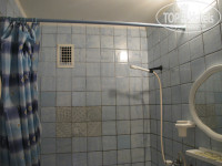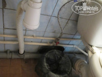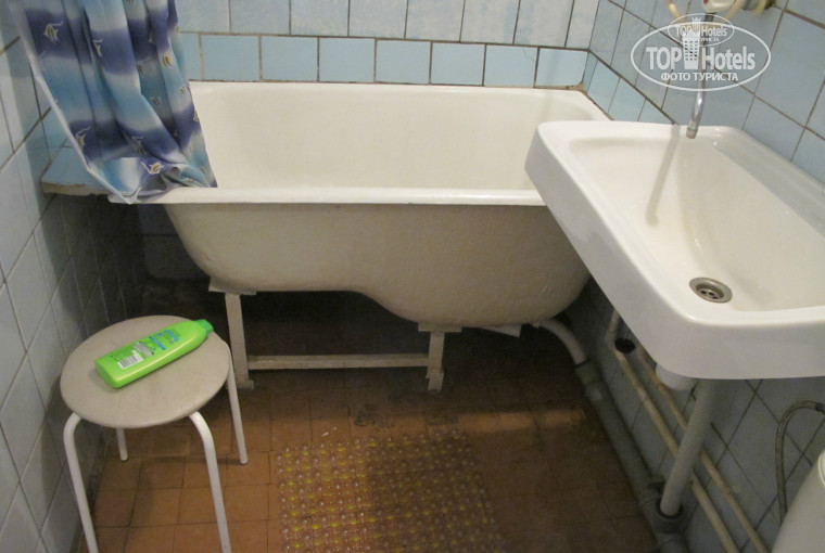 Номер оказался достаточно просторным по размеру и светлым, но санузел - это ужас. Нам достался номер с ванной. Сразу в глаза бросились облупленные, с подтеками, потолки. Стены обложены плиткой 70ых годов общественных туалетов, и та местами отвалилась и была заменена первой попавшейся, разноцветной, взятой видимо со свалки. Холодный полотенцесушитель, душевая лейка дырявая. Но больше всего поразила ванная и унитаз. Ванная маленькая, сидячая, на металлических ножках и такой высоты, что забраться и выбраться из нее без посторонней помощи, не рискуя нанести себе увечья, невозможно. Стандартная высота бортика ванной 50 см, здесь же она получилась 65 см. Наверное для удобства захода в это "сооружение" рядом стоим табурет на металлических ножках. Унитаз тоже на деревянном, сгнившем постаменте, завален назад и качается. Везде по углам чернота и грибок. Остается загадкой, как могла СЭС допустить к эксплуатации такие санузлы.