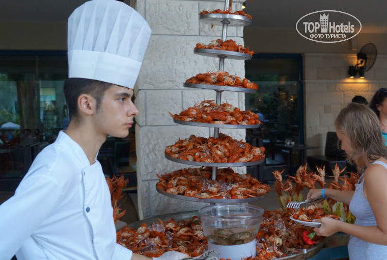 Питание- начитавшись здесь УЖАСОВ, что мы будем голодные и злые, даже не много радовалась, что не поправлюсь, НО.. не тут-то было)). За питание, ставлю твердую ПЯТЬ! Всего много, мясо, рыба, овощи, фрукты, сладости.. как только что-то заканчивается, сразу выносят новый поднос.ВСЕГДА супы(даже на завтрак), у них они супы-пюре. Был один день раков и ролов. При входе девушек приветствовали гвоздичкой приятно. Украшено красиво, на каждом столе всегда на ужин, в ведре , бутылка вина!.Кстати, на обед ходили всего один раз, после экскурсии проголодались, а в основном в обед есть не хотелось, перекусывали лепешками с картошкой(пекут прям при тебе), или в баре возле горок, там гамбургеры, шаурма, картошка фри и всякая другая ВКУСНАЯ гадость))).Еще возле входа на пляж, запечёня картошка в фольге, можно с начинкой взять, но я просто брала,а, и там же сенгвичи. Отдельно хочу сказать, про турецкий чай- Очень нам понравился! он в железных чайниках. есть везде. так же очень вкусный кофе готовят в кофе-баре.Особенно ЛАТТЕ. Напитки-Спрайт, кола, швепсы- льются рекой)).автоматы с "соком". Хорошее пиво, и разливное и в бутылках. Алкоголь весь местный,а в Тропикано баре- наливают настоящий мартини, бренди, шампанское,белиз,и кажется ром тоже импортный.(один раз пробовали махито).