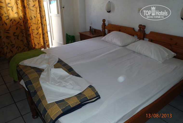 Всем привет.Начну с самого главного,ОТЕЛЬ.Уважаемые туристы данный сайт-отзыв об отеле,не забывайте!Отель на самом берегу моря 30 метров и вы у моря!Мы жили на 3-ем этаже в 305 номере,он у нас выходил балконом на другой отель,узкую улицу и было видно кусочек моря.У нас были лишь отголоски музыки от Palm beach,у кого балкон выходил на другую сторону можно было танцевать прям в номере,слышимость 100%.Это молодежный отель,и мы знали куда мы едим так что музыка нас не смущала.Расположение отличное,отель берет начало побережья, всей жизни(тусовочной)Херсонисосса.Сам номер:чистый,в греческом стиле,шкаф большой(вещи будет где разместить:)),две кровати,по бокам тумбочки,трюмо(с пуфиком и зеркалом),огромный балкон,мы там в 5 сидели и было просторно.Пульт от кондиционера бесплатно,подходит на ресепшен спрашиваете и вам без проблем дают пульт.Отдельно про ванну:вода нагреваться от солнечных батарей,так что с утра и вечером прохладная,с 13 и до 19 отличная для принятия душа.маленькая душевая,дверь при открытии упирается в раковину,на унитазе сидишь как на троне.Ключи оставляли на ресепшен(тяжело носить с собою).Имейте в виду все номера разные(у кого есть холодильник,у нас не было,у кого то не было кондиционера,у нас он был,у кого то была ванная,у нас был душ)Вообщем как попадете.Завтраки за 15 дней не меняются(чай,кофе,сок(юпи)йогурт,хлопья,масло и джем(как в самолете маленькие упаковочки).На каждом этаже своя уборщица,у нас она была классная,оставляли специально всегда мелочь,на тумбочке на столе,никогда не брала!!!Пока сама не подойдешь и не дашь.Так что,с воровством у нас лично на этаже,все было в порядке(вот на первом этаже,девочка,пожаловалась,у нее отлили гель для душа и разбавили водой)я конечно сомневаюсь в правдивости данной истории но все же.Убирала чисто,крутила бантики,чаще заведенного меняла полотенца и простыни.Хозяин хороший,что не попросите все бесплатно(утюг,фен),в последний день своим виноградом угощал(кило 3 точно было в пакете)В отеле бесплатный вай фай.Море(для меня лично оно было холодное,ветер ужасный)Вход в море у отеля совсем не удобный(камни,скользко и волны,были и такие,что,сбивали с ног здоровых мужиков).Еда:порции большие и вкусные(самое дешевое кафе как ни странно напротив отеля RUSTIKO)Сравните цены и вкус еды поймете сами)Брали экскурсии на улице(санторини,спиналонга,агиос николаус,залив мирабелло(вот он прекрасен)!!!!)Сама Греция бедная страна,лично меня она не впечатлила,но оставила небольшой след в моей памяти)))