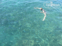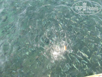 Море. Красивое, чистое. Водоросли, которые периодически прибивались к берегу, нас не напрягали, море же очень живой организм! Много фигни у берега – можно пойти с пирса поплавать! У берега очень кровожадные рыбки, которые хватают за ноги, в очках под водой наблюдали за этой картиной – очень весело! Но потом мы придумали – если купаться в тапочках (девочкам – в так называемых «мыльницах»)– они особо не нападают, боятся! Метров за 50-70 от берега есть большие камни, доплыв до которых можно передохнуть, постоять… У пирса, как уже говорилось во всех наверно отзывах, много-много рыб, прямо селедок. Их утром сотрудники отеля прикармливают – выносят целый огромный мешок вчерашнего хлеба и вместе с ребятнёй раскидывают его у пирса. Мы в принципе булочки из ресторана брали, на забаву. Зрелище интересное – 5 секунд и булки нет! Черепаху видели у пирса «16+».