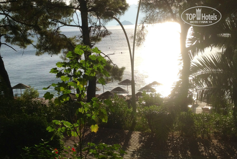 Отель расположен на берегу моря и весь утопает в зелени.Когда гуляли по променаду,убедились что наш отель имеет самое хорошее расположение.Территория отеля довольно таки приличная,есть где погулять и полюбоваться природой.По территории растут разные кустики с красивыми цветами.Воздух просто пьянит(да и гиды говорят,что воздух целебный).Осы были,но они дружелюбные,нас не кусали,на улице мы не кушали,поэтому не знаем как они реагируют на еду,но они любят газировку,поэтому на баре им специально в углу ставили бокальчик со спрайтом.