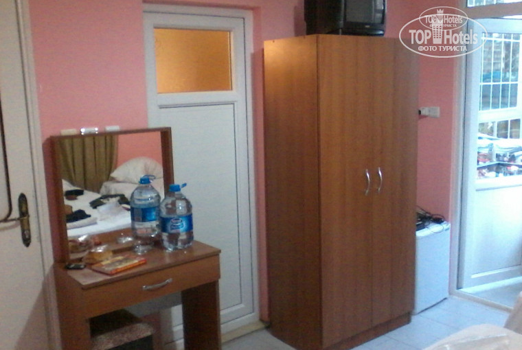номер -недорогой но чистый ремонт-мебель новая-но тоже недорогая-дсп. санузел-чистый есть фен-ванны нет- только душ. телевизор-не очень-шаборшал все). зато кондиционер работал отлично! холодильник новый но хитро отрегулирован-ничего там не заморозишь. балкон выходил на бассейн соседнего отеля. приборка в номере с 3го напоминания-вымоют пол и выкинут мусор-полотенца не меняют. на ресепшене -русский- Юрий-очень вежливый)