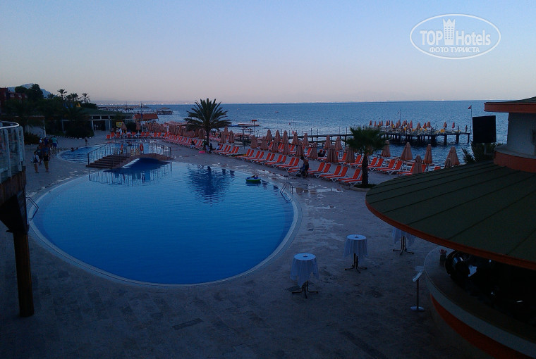 Территория отеля-небольшая,можно обойти за 5 минут. Есть амфитеатр,бассейн, 2 горки мы на них 1 день покатались часик,было весело,особенно с турецкими женщинами в черных купальных костюмах))