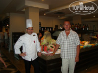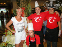 С пожеланиями : «приятного аппетита»,- при входе в ресторан отдыхающих всегда встречал приветливый шеф-повар. Хочется ему сказать : -«Большое спасибо!» . Блюда были разнообразными и на любой вкус: жареные, вареные, тушеные, печеные… Многообразные соусы, специи, приправы. Вкусные супы, молочные продукты, удивительная выпечка, кондитерские изделия. А на ужин отдыхающих всегда ждали огромные торты с логотипом отеля. Ммм…пальчики оближешь!!!! Кондитерам – спасибо!