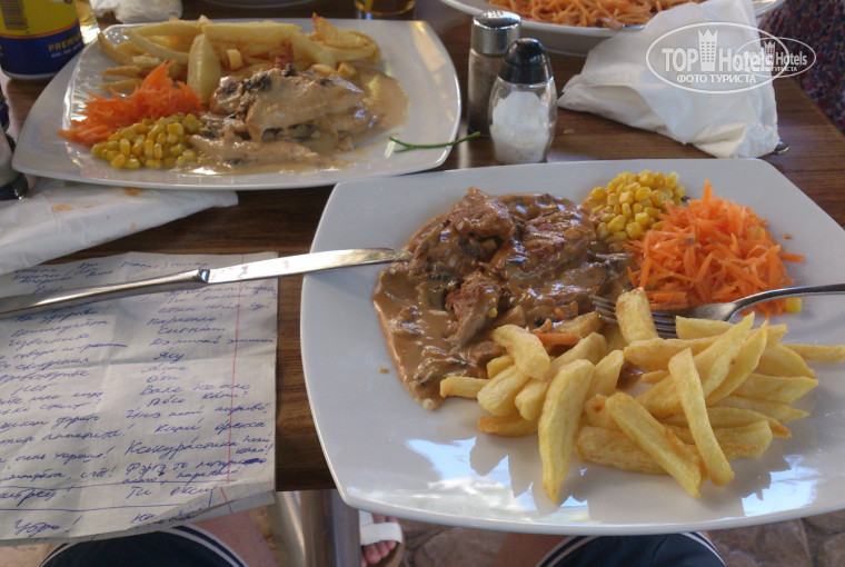 Питание в самом отеле. Останавливаться на этом не буду, это все подробно описано в других отзывах. Завтраки стандартные, они на Кипре все такие, примерно то же дают и в Египте. Сосиски такие же безвкусные. Ужины очень даже впечатлили, повара-болгары готовят очень хорошо, реально 5-6 видов мяса. Ужины правда очень и очень хороши.