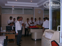 Согласна с отзывом от Svantison. Действительно в этом году увеличелось количество официантов (зачем?) и каждый ждет, что работу выполнит кто-то другой, а не он))) Их руководитель каждый день проводит инструктаж (что там можно каждый день им объяснять не понятно), см. фото. Причем такое ощущение, что он их ругает. Сам же сядет с каким-нибудь туристом-турком и начинает болтать.