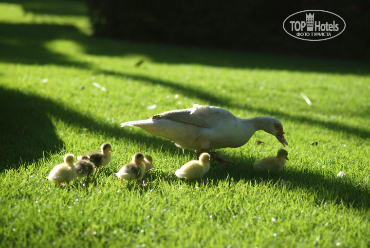всякая живность: уточки, малыши утята (которых можно даже подержать в руках), попугаи, павлины, рыбки в пруду,