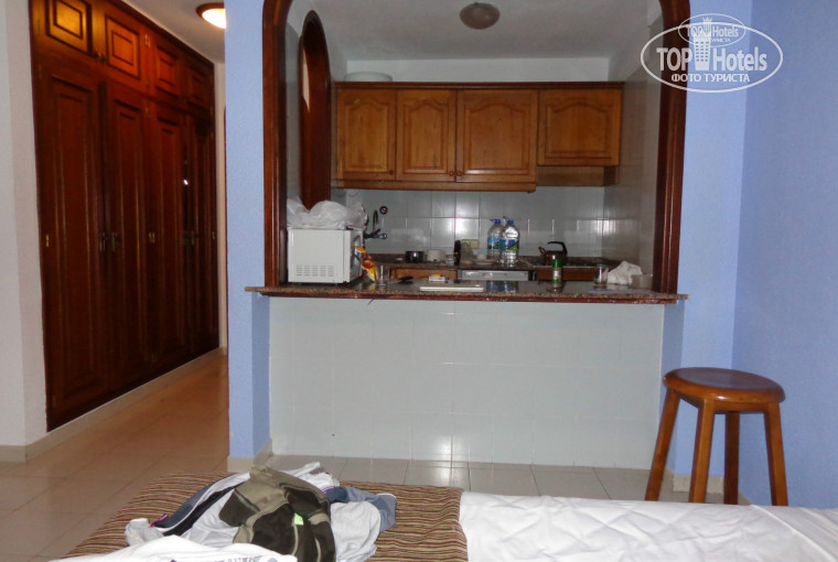 Номер. У меня была студия (комната с кухонным отсеком) не многим больше обычного гостиничного номера. Техническое состояние и комплектация номера оставляет желать лучшего. Тут мне достались все прелести советского общежития – это толком не работающее освещение, звонок в номер не работал вообще, вываливающиеся и держащиеся только на проводах розетки, причем половина из них как нарочно была заставлена мебелью. И для кучи полное отсутствие не то, что кондиционера, а элементарного потолочного вентилятора. Вентиляторы отдельно за плату дают в прокат на рецепции и стоит это удовольствие 20 Евро в неделю (!) – дешевле купить в хозмаге или у индусов, которые там традиционно продают бытовую технику и электронику. Комплектация кухни тоже оставляла желать лучшего. Нет тебе тут консервных ножей и штопоров и прочей мелкой сопутствующей кухонной утвари, остро необходимой для готовки пищи , вытяжка над плитой отсутствует вообще, две конфорки на электроплите не работали . Деление переключателей на плите не сохранилось под действием времени, так что приходилось мощность нагрева устанавливать методом научного тыка. Если уж надумаете здесь останавливаться, не забудьте взять с собой универсальный перочинный нож со штопором и консервным ножом - лишним точно не будет. Так же, отсутствовал электрочайник, или аналогичное ему электроустройство для быстрого кипячения воды, но который можно было взять в прокат за 20 Евро в неделю на рецепшен (!). И на десерт всех «прелестей» номера – это платное телевидение с безумным количеством (всего 6 , втч российское ОРТ) каналов за 20 Евро в неделю (!). Это при всем при том, что 21 век на дворе. Сейф тоже платный – 20 Евро в неделю и 5 Евро депозит-залог за ключ.
