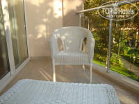 Балкон большой, хорошенький. Там 2 кресла плетенные и столик.