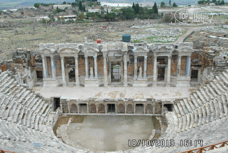 HERAKLIES - это древний город, развалины которого находятся в 5 минутах езды от отеля, это место более известно под названием Помуккале. Представьте себе возвышенность или даже гору, на которой располагается древний город (ему много тысяч лет), точнее то что сохранилось, это остатки каменных строений, различные орнаменты, древние надписи, мостовые и конечно амфитеатр (один из наиболее сохранившихся в мире. И у подножия всего этого культурного ансамбля располагаются своеобразные терассы из извести с термальной водой которая непрерывно вытекает из под земли, образую белые скалы и сливаясь мелкими ручейками в озеро у подножия горы (в прозрачной воде которого можно увидеть большое количество рыбы, и водоплавающих птиц греющихся в тёплой воде.) Кстати размер этих скал впечетляет, в ширину около 4 км. На территории Гераклиона есть бассейн с раздевалками, в котором можно плавать сколько угодно, заплатив предварительно 15 долларов. Вода в бассейне очень чистая, потому что проточная и на вкус напоминает боржоми. В дни нашего посещения (в октябре) было довольно прохладно, около 15-16 градусов, поэтому погреться в таком бассейне было особенно приятно. В общем, впечатления очень позитивные.