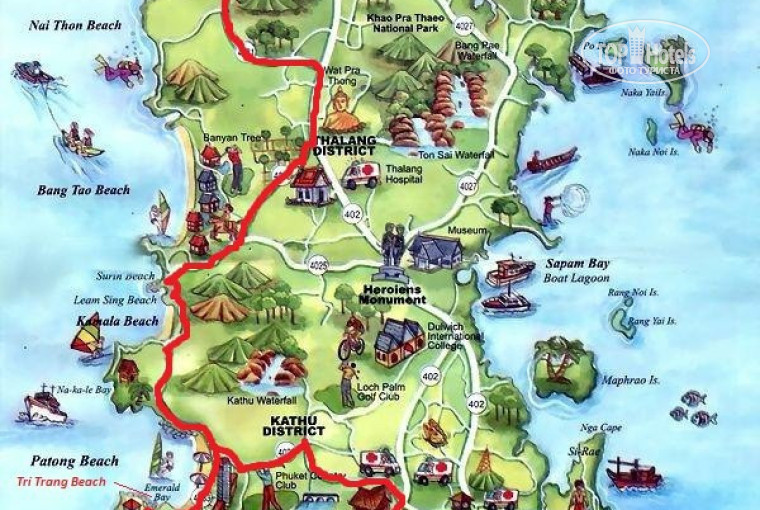 РАСПОЛОЖЕНИЕ: Находится в тихом и небольшом районе Камала, как таковых развлечений кроме ресторанов, кафе там нет, но нах-ся недалеко от Патонга, если вдруг потянет в клубы, шоппинг или какие либо развратные местечки Патонга:)до Патонга на туки-туки ( такси) договорились за 400 бат , обычно 500, оно вместительное поэтому соберете компанию 5-6 чел и вообще копейки с чел получается.