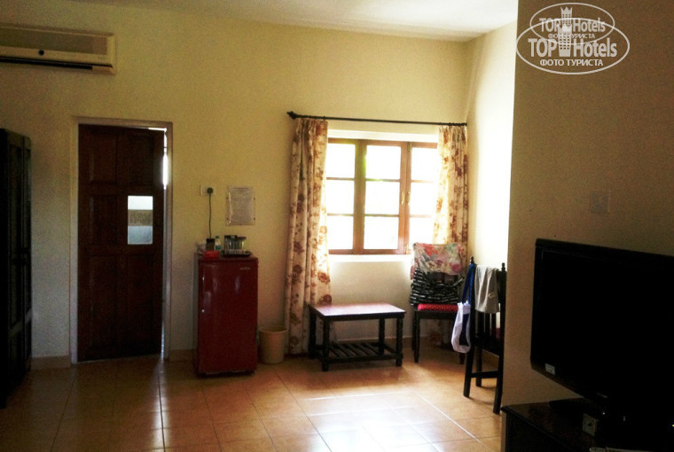 Добрый день дорогие друзья. Хочу поделиться своими впечатлениями об Индии и отеле Resort Marinha Dourada 3*. Отдыхала там с подругой в начале марта, в Индии были впервые, летели из Санкт-Петербурга. Перелет занял 7 часов 40 минут, выйдя из аэропорта, наши первые впечатления об Индии были ужасными – грязно, но потом привыкли и грязь не замечали. Отель очень порадовал своей идеальной чистотой, территория ухоженная и очень большая, круглосуточно они что-то чистят, подметают, стригут, поливают и т.д. Номер (№159) нам достался в третьем корпусе. Корпус новый, номера большие, чистенькие, с хорошей мебелью, c большим ж/к телевизором, сантехника хорошо работала, всегда была горячая вода. Когда мы заехали в этот номер, он мне первоначально не понравился, хотелось разместиться ближе к рецепшену, но потом, поняв, что этот номер не солнечный, не слышно шума из отеля, под окнами никого нет, мы его оценили как один из лучших вариантов.