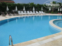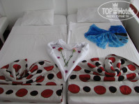 Ездили молодой семьей в мае 2013 на 7 дней. Осталась в неописуемом восторге! Расселили достаточно быстро, номер - прекрасный, две огромные кровати, детская двухъярусная кровать, кондиционер, телевизор, мини-холодильник, сейф, шкаф, совмещенный санузел. Номер на втором этаже, балкон выходит на парадный вход отеля. Все довольно чисто, уборка номеров раз в день. За чаевые "сервис рум" радовала нас стаей лебедей из полотенец, лепестками роз. На территории отеля есть сауна, спортзал, теннисный корт (ракетки за дипозит), три бассейна: два открытых (детский и взрослый) и один крытый (полотенца выдаются бесплатно), две водяные горки (правда, работают в определенные часы), несколько магазинчиков, два ресторана, посетить которые можно лишь раз за время пребывания (предварительно нужно записываться), платный хаммам.