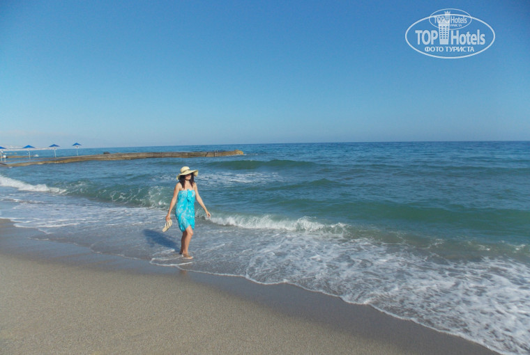 от отеля совсем недалеко до моря, налево-песчаный пляж отеля Грекотель, направо чуть подальше минут 8-10 пешочком чудесная бухточка с мелкой галькой (туда приезжают местные купаться), вода там чище и прозрачнее естественно чем на песке.