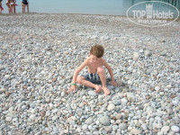 Галька с песком, местами галька довольно крупная, если детки маленькие, то не сильно комфортно, но пляж широкий, места много, на пляже есть детская площадка.