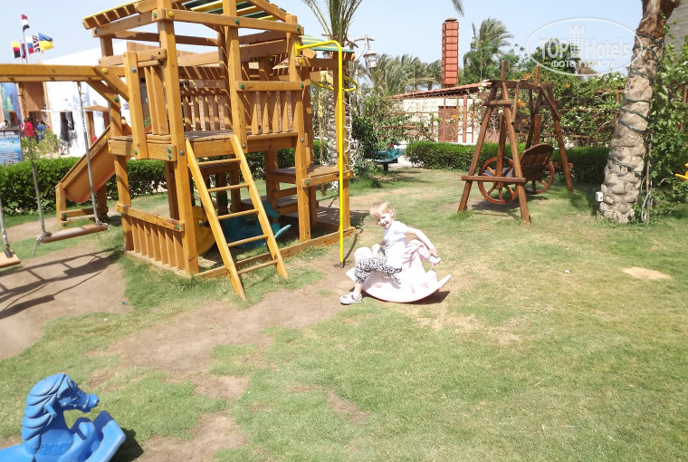 Территоря у отеля небольшая. Пракически ее нет. Бассейн (вода холодная, но не критично), небольшая детская площадка с горкой и качелями, волейбольная площадка и пляж. Пляж чистый, ухоженный. Лежаков и матрасов хватало всегда. Прямо на пляже расположен дайвинг-клуб, где можно взять ласты и маски и поплавать в море. Правда смотреть там, как оказалось, особо нечего. Рыб мало, в основном ежи в камнях сидят и все. Море все 10 дней почему-то было мутное, прозрачности практически никакой, хотя глубина - до колена. С чем это связано - незнаю. Мы ходили купаться с понтона. Есть три лестницы в разных местах и в одном месте можно прыгать - там глубина около 2 метров. В этом же дайвинг-центре можно брать эксукурсии. Ездили от этого дайв-клуба на дайвинг: погружение с аквалангом вдвоем с мужем плюс ребенок просто находился на корабле. Погружение у рифа 25 минут на глубину 8 метрв, плюс снорклинг, обед из морепродуктов и посещение Райского острова. Все понравилось. Обошлось в 85 долларов. У гида было 110.