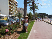 Расположение отеля очень удобное! Выйдя из отеля, можно по лестнице спуститься, чуть пройти и будет пляж спокойный с белым песочком, а если пройти через рыночек, по центральной улице, то попадаете на центральный пляж, где если хотите, можно познакомиться с шикарными испанскими мачо) Кстати, вечерами на этой улице тоже очень людно и клубы зазывают многочисленные. Нам понравился только один, куда с удовольствием ходили!