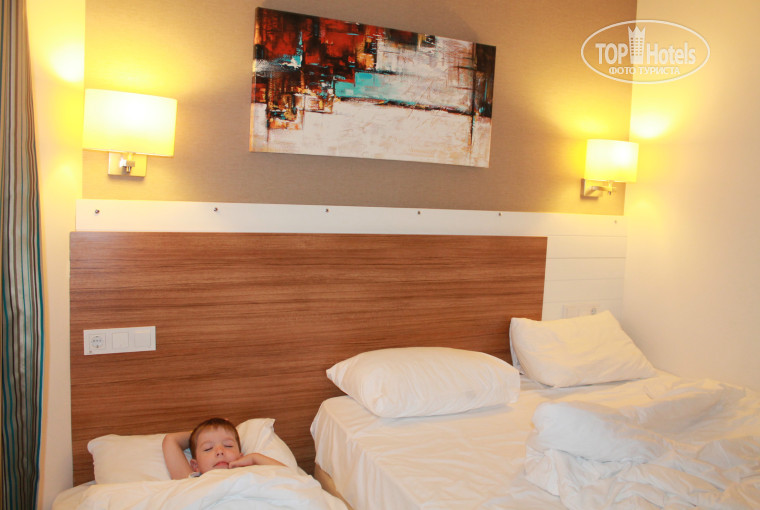 От аэропорта минут 15-20. Приехали в отель в 4 утра, заселения ждали до 14.00 (за это время позавтракали, сходили на море, пообедали). Номер был стандарт - номер небольшой, но уютный, всё новое, всё работает. Попросили дополнительное место для ребенка, но пришлось сдвинуть двух спальную кровать и рядом поставить раскладушку, иначе просто некуда поставить, разве что в коридор.