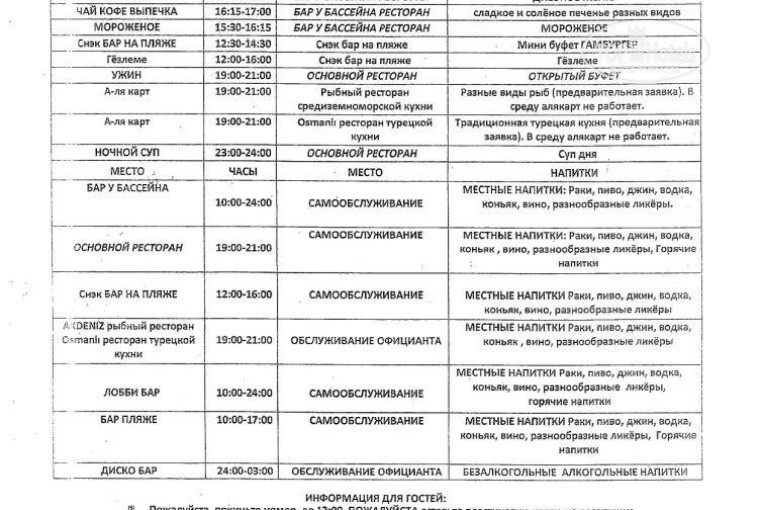 Концепция «все включено» 5 баллов. Выкладываю вместе с отзывом скан расписания сервиса отеля, дабы избежать излишней писанины. Там все подробно расписано, если будут вопросы, задавайте. В дополнение, что касается напитков. Для детей помимо классических фанта, кола, спрайт имеются фруктовые сиропы из всего этого делают коктейли, можно даже попросить молочный (естественно бесплатно). Для взрослых: пиво «Туборг», ракия, вино (льют из бутылок!), водка, коньяк, джин, виски (правда, радикально белого цвета), несколько видов ликеров. Есть еще в меню список бесплатных коктейлей, которые в принципе делаю из вышеперечисленных ингредиентов. Из безалкогольного очень неплох и освежает айран (предлагается на ужине и в баре на пляже)