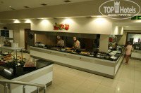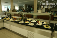 Далее лежат сыры нескольких видов, брынза, колбаса трёх видов, язык отварной, нарезка свинная двух видов...Рядом стоит тостница с нарезанным сыром и хлебом, варёные яйца. Супчик представлен тремя видами: молочным, вкусным грибным и средненьким куринным....Горячее мясное: курица 2-3 видов приготовления, язык, ягнёнок, говядина. Из гарниров рис, вермишель, картошка в различных вариантах.Для европейцев стоят различные мюсли.....Из фруктов постоянно есть вкусный арбуз,