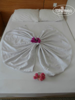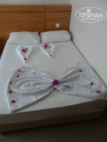 Здравствуйте! Впервые с мужем собрались посетить Турцию и, после долгих раздумий, выбрали этот отель (спокойный и семейный). Отдыхали 10 дней с 24.06.2014 по 04.06.2014 (летели с Пегасом). В отель прибыли в районе часа дня по местному времени. На рецепшене нас сразу одарили улыбкой, одели браслет и отправили обедать. Заселили в 14.00 с небольшой доплатой, так как у нас был забронирован 2-х местный номер, а нам предложили 3-х местный номер ( 2 кровати, 1 большая и одна маленькая) на 2 этаже с балконом ( большой плоский телевизор с 16 каналами, штук 5 из них русские, кондиционер, фен , сейф за отдельную плату в 20$, мини-бара не было, но мы его и не просили). В номере выполнен новый ремонт, все аккуратно прибрано (чистота и порядок), на полу красивый ковер, в ванной стеклянная душевая кабина, плитка. Остались более чем довольны все на 5 баллов. В номере убирались каждый день, меняли полотенца( и маленькие и большие). За символические чаевые, девушки уборщицы создавали приятный вид нашей кровати ( даже украшали цветами). Сервис супер! Персонал просто замечательный, отзывчивый, улыбчивый. Мальчишки официанты не дают задержаться вашей грязной посуде на столе во время еды и минуты. Питание разнообразное на твердую 4, голодными не останетесь: овощи, фрукты, рыба (шеф повар 1 день приготовил нам даже тунца) , курица, салатики и т.д. Сладости отдельная тема - пальчики оближешь. Огромное спасибо нашему шеф-повару! Выжимал из своего бюджета для отеля все, что мог. Море (добираться 3 мин. легким шагом) чистейшее, прозрачное, вход нормальный. У отеля свой пляж - шезлонги, лежаки, матрасы, даже если не хватит ( с нами такого не случалось) всегда можно занять место на пляже соседнего отеля. Минус это бар на пляже, от которого много не ждите, кофе и напитки типа Юпппи, но, в принципе, он нам и не был нужен. В отеле имеется бассейн с чистейшей водой, горка на которой катаются и взрослые и дети ( есть "лягушатник" для самых маленьких). Шезлонги, лежаки, матрасы, столики. Бар в который начинает работать с 10.00 до 18.00 в котором вы можете взять прохладительные безалкогольные напитки местного производства ( спрайт, фанта и т.д), а также вполне сносный алкоголь ( пиво, вино, водка). Отдельное спасибо Метину и его малочисленному персоналу(найдете рядом с баром) за его наивкуснейшее мороженое в дыне (обязательно попробуйте), свежевыжатые соки. В отеле есть еще два бара: один в ресторане (работает во время завтрака, обеда, и ужина), второй находиться на терассе (работает с утра и до 24.00), алкоголь наливают до 22.00. Если нужно отдохнуть можно перейти дорогу и посидеть в одном из 2-х баров ( в баре Ci-Ci по вечерам, всегда играет живая музыка), либо прокатиться до ночного клуба, в который туда и обратно вас доставляют. Территория отеля хоть и небольшая, но зеленая и опрятная. Присутствуют игрушки для детей, разные горки, лошадки. Аниматоры просто супер, огненное шоу, небольшие конкурсы. Играли в водное поло, уже по нашему отъезду начали проводить водную аэробику. В 21.00 до 21.30 каждый день замечательная детская дискотека. Родители, милые, принимайте участие вместе со своими детьми - от этого только веселее и ярче мероприятие. Потом до 23.00 можно уже взрослым устраивать себе дискотеку. Отдельное спасибо турецкому хамаму. Администратору Ольге и массажистам, Вулкану и Осману. Как и обещала передаю Вам огромный привет!!!Парни, вы супер!!!Об