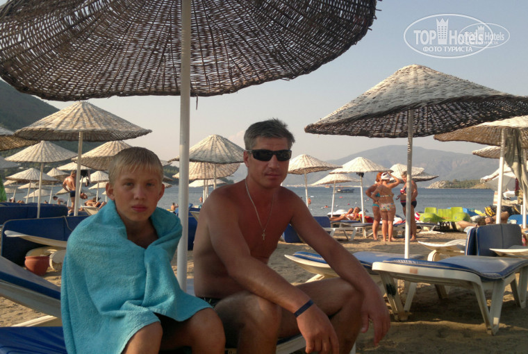Пляж у отеля небольшой, с бдительным дядечкой. Пляж как пляж, не хватает ему бара и туалета, а так - ничего. Мелко. Мой муж со своими 1,90 см только после буйков почувствовал себя в море, а не как в луже. А по мне - с детьми самый оно. Ходили купаться поздно вечером от безделья - увидели кучу живности в море, в том числе скатов. Ужас, потом реально страшно было заходить в воду ))) Кстати, проблем со свободными шезлонгами никогда там не было в любое время дня.