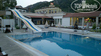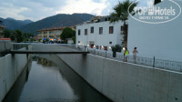 Территория отеля довольно большая (мне так кажется), но абсолютно лишена зелени, всё застроено, разные закутки, бары и прочее. Но очень удобно, всегда есть где присесть. Мы заценили греческий бар с синими диванчиками, единственное - периодически мокрые сидения из-за, блин, несознательных людей, которые в купальниках сидят. Порадовали 2 достаточно больших бассейна - мои дети просто не вылезали. Конечно, с шезлонгами беда полная: не займешь с ранья - не позагораешь. Да и горка в одном из бассейнов такая, что можно остаться без тазовых костей ))) Присутствует прикольный, но немного пованивающий канал с мутной водой, кишащий просто безумными рыбами, кидающимися как пираньи, на любую еду, прилетающую к ним. Отель разделён дорогой на 2 части, но это не так неудобно, как может показаться: движение по дороге небольшое, в общем, не напрягает.