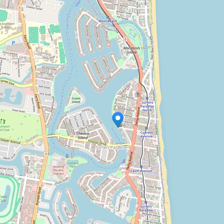Отель расположен в 500 м от знаменитого песчаного пляжа Surfers Paradise, в 40-50 минутах езды от аэропорта Gold Coast Airport (Coolangatta), в 70-90 минутах езды от аэропорта Брисбена и недалеко от нескольких тематических парков.