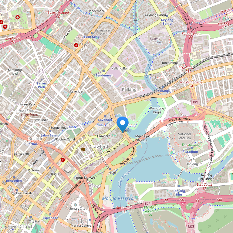 Отель находится недалеко от центра города, всего в 5 минутах ходьбы от станции метро Lavender и района Кампонг-Глам, где работают многочисленные малайские и арабские магазины и рестораны, в 10 минутах езды от популярных ночных клубов на набережных Клар-Ки и Бот-Ки. До выставочного и конференц-центра Сантек-сити около получаса ходьбы. Международный аэропорт Чанги расположен в 20 минутах езды.