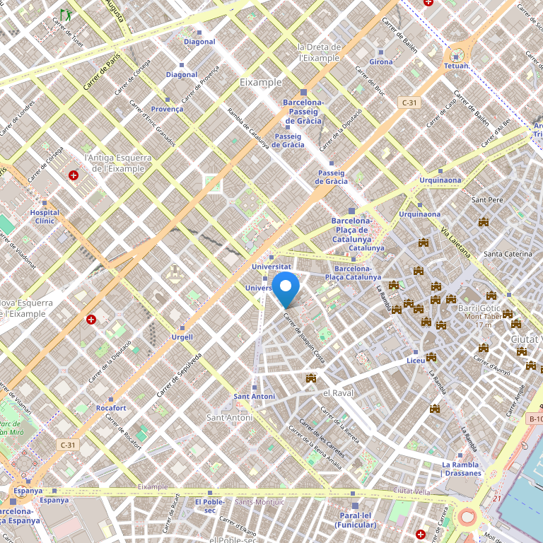 Отель расположен на улице Гран Виа, в 5 минутах ходьбы от площади Каталонии, бульвара Ла-Рамблас и Пасео де Грасиа.