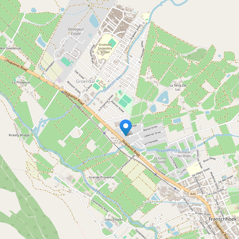 Этот небольшой бутик-отель расположен на окраине города Франшхук (всего в 1 км от города), неподалеку от мыса Уайнлендс, окруженными винными хозяйствами и горами. Франшхук находится всего в 45 минутах езды от Кейп Тауна и международного аэропорта Кейп Тауна. Городок окружен величественными горами и живописными виноградниками и известен как винная столица ЮАР.